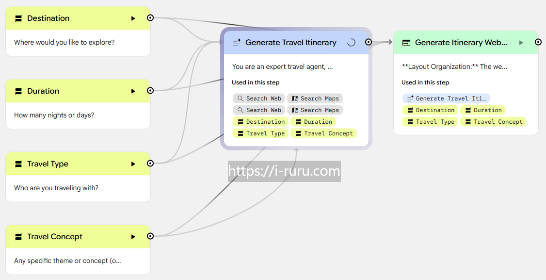 - 실제 예시 입력: "도쿄", "3박 4일", "어린이 동반 여행 일정을 짜줘 or '현지인 맛집'과 '빈티지 레코드샵' 투어 or 놀이동산 캐릭터 샵 위주로 추천 "