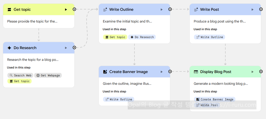 - Opal (오팔): '공장'입니다. 구글 랩스(Labs)에서 제공하는 노코드 빌더로, "이런 앱 만들어줘"라고 말하면 AI가 로직을 짜줍니다. '워크플로우(Workflow)' 형식으로 어떤(예: 블로그 글 작성) 목적의 앱을 만들어서 템플릿 화 되어 있는 AI 도구로 활용할 수 있어요. 아직 실험실 단계라서 무료 사용해볼 수 있어요. (https://opal.google/)