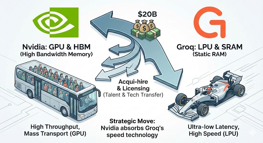 엔비디아가 AI 추론 칩 스타트업 Groq의 기술과 인력을 약 200억 달러(26조 원)에 흡수했습니다. 이는 단순 인수가 아니라 규제를 피하기 위한 '역인수(Reverse Acqui-hire)' 전략입니다. 엔비디아는 유일한 약점인 '추론 속도(Latency)'를 해결하고 2028년 하이브리드 칩으로 시장을 끝장낼 계획입니다.