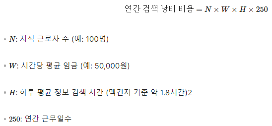(※ 실제로는 검색 시간 중 일부는 필수적이므로, 이 중 '비효율적 검색' 비율인 30~50%만 적용해도 연간 수십억 원의 손실이 발생합니다.)