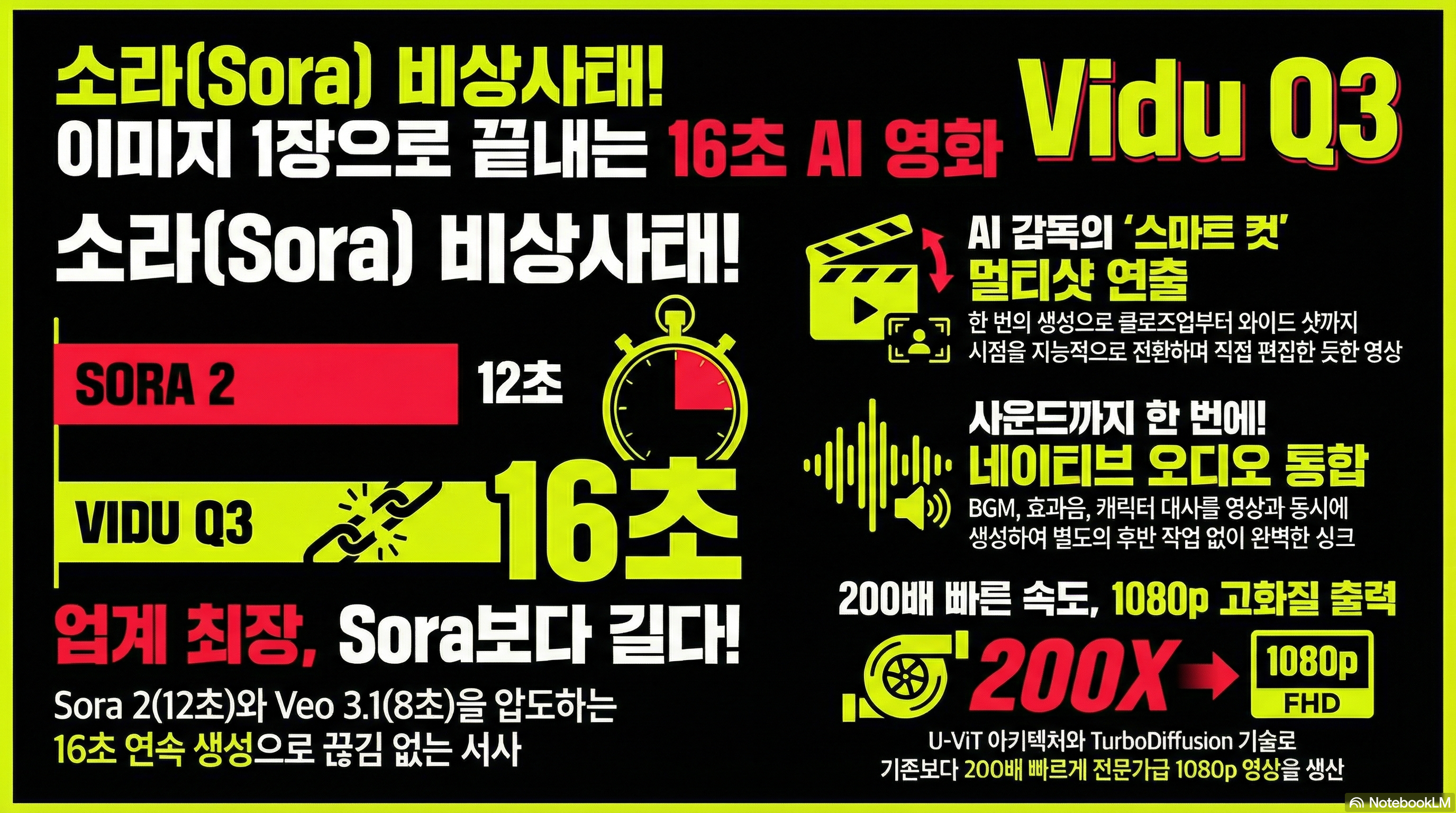 Vidu Q3는 업계 최장인 16초 영상 생성과 네이티브 오디오-비주얼 통합으로 후반 작업 파이프라인을 혁신해요. 물리적 정확성의 Sora 2, 정밀 제어의 Kling O1 사이에서 '서사적 완결성'을 무기로 독보적인 위치를 점하고 있죠.