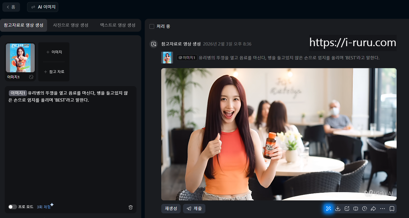 아래의 영상과 캡쳐 이미지는 제가 Vidu Q3에서 광고 CF 사진 한장으로 영상을 만들 수 있는지 테스트해 본 캡쳐입니다.