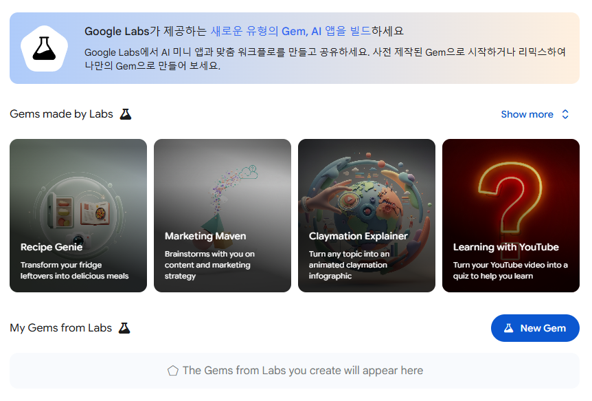 Gemini에서 'Gems 탐색하기'에 들어가면, 최근에 Super Gems 기능이 위에 추가가 되었고, 내가 만드는 Gems를 기존보다 더 강력한 기능을 제공한다.