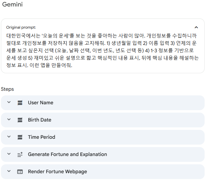 아래는 Super Gems를 통해서 간단히 만들어본 '오늘의 운세, 사주팔자' 관련된 App을 아주 쉽게 만들어본 사례에요. Super Gems에서 만들고 싶은 내용을 프롬프트로 만들었고, Step처럼 입력받는 값들, 뒤에 생성하는 운세, 그 뒤에 표시해주는 흐름으로 App을 만들도록 시켰어요.
